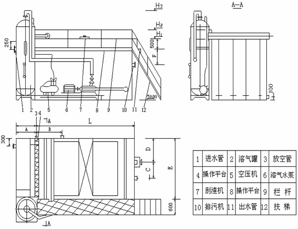 設備結構 YF一元化氣浮裝置有五個部分:加藥絮凝部分、回流水溶氣釋放部分、氣浮部分、刮渣部分、電氣控制部分。 |