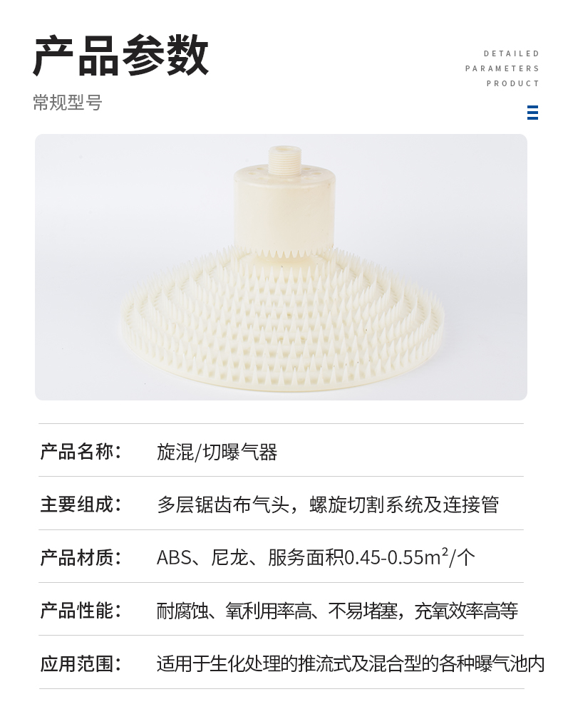 旋混式曝氣器采用多層螺旋切割的型式進(jìn)行充氧曝氣,旋混式曝氣器當(dāng)氣流進(jìn)入260型混流型曝氣器時(shí),氣流首先通過二道螺旋切割系統(tǒng),切割后進(jìn)入下層的的多層鋸齒型布?xì)忸^,進(jìn)行多層切割,使氣泡切割成微氣泡,這樣大大提高了氧的利用率,具有布?xì)饩鶆颍溲跣矢叩奶攸c(diǎn)。